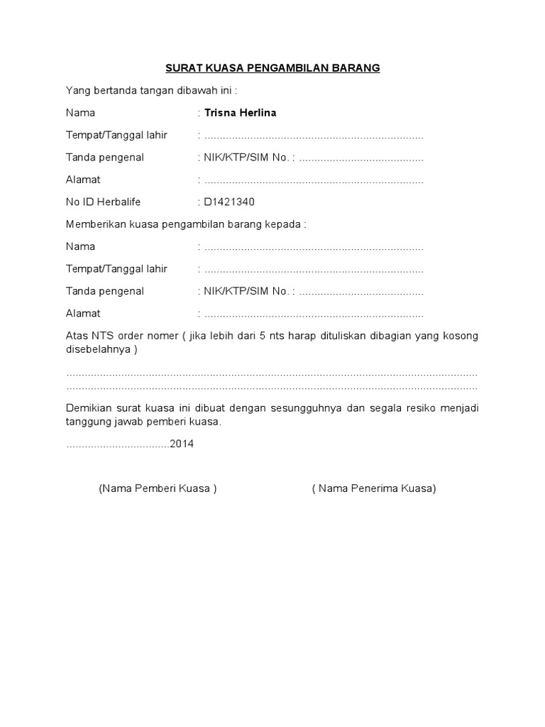 Surat Kuasa Pengambilan Barang Pdf
